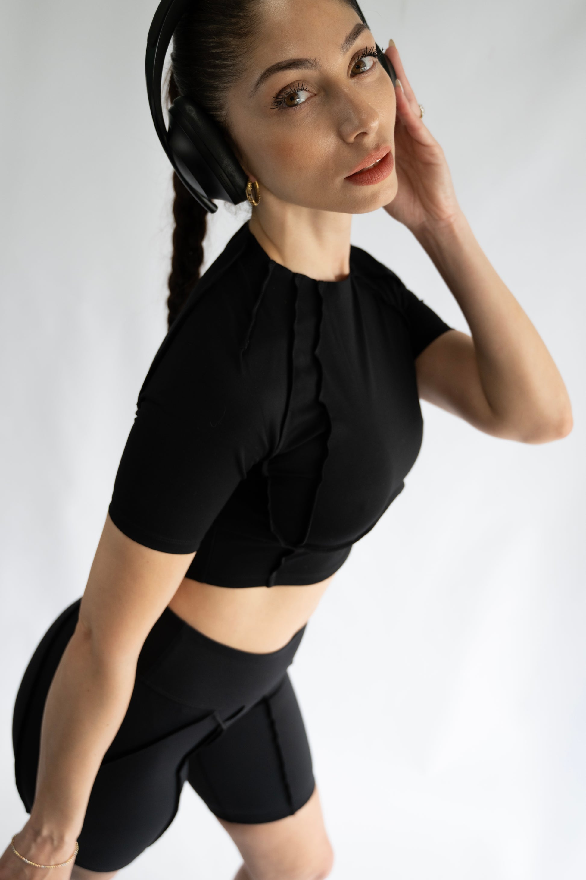 A bold and structured take on the classic cropped tee. This top features a sophisticated mock neck and unique short sleeves that are balanced by intricate, outward-facing seam paneling. Designed to define the bust and cinch the waist, the architectural structure provides a secure, compressed fit that moves with you. Crafted from the same signature textured black fabric as the rest of the collection, this top delivers high style and high performance